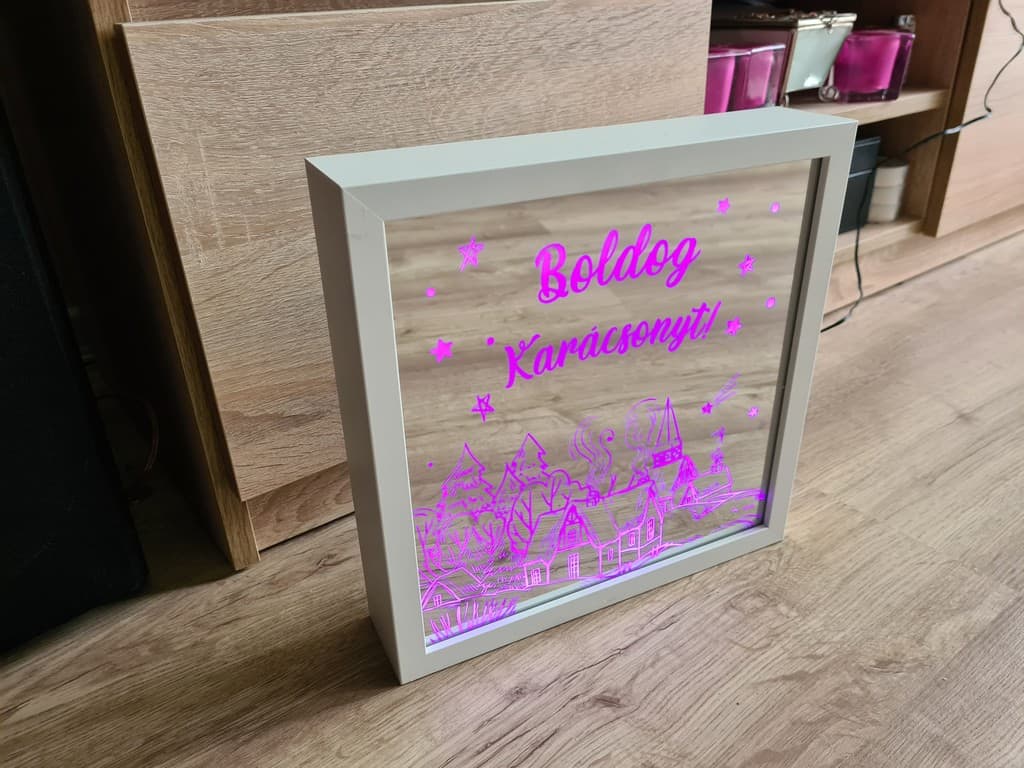 1 x Boldog Karácsonyt mintával gravírozott tükör fehér vagy fekete képkeretben.